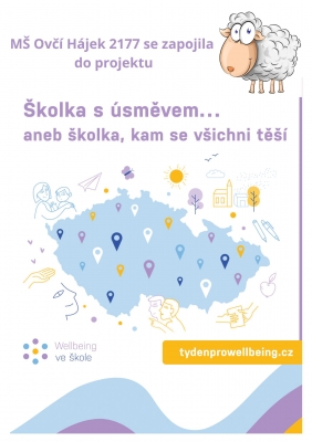 V týdnu od 4. února do 11. února jsme se v naší mateřské škole Ovčí hájek 2177 zapojili do celorepublikové iniciativy Týden pro wellbeing pod názvem „Školka s úsměvem“. Tento týden je věnovaný podpoře pohody, dobrých vztahů a celkovému pocitu spokojenosti dětí i dospělých ve školním prostředí. Celorepublikový projekt si klade za cíl ukázat, že wellbeing - tedy pocit, kdy se člověk cítí dobře, bezpečně a má podporu pro svůj rozvoj - patří k běžnému životu ve školách i školkách a není jen „nějakým doplňkem“. Týden pro wellbeing ve škole probíhá v celé České republice a do akce se zapojují stovky škol, školských zařízení, organizací a pedagogů, kteří společně sdílí inspiraci, nápady a metody, jak podporovat duševní zdraví, pozitivní vztahy a radost ze společného učení a hraní. V rámci našeho projektu „Školka s úsměvem“ jsme se s dětmi věnovali tomu, co wellbeing znamená v jejich každodenním životě. Každý den jsme společně objevovali malé i velké věci, které nám přinášejí radost a pocit pohody. Paní učitelky připravily mnoho kreativních aktivit: malování pocitů, společné tvoření, krátké relaxační cvičení i rozhovory o přátelství a důvěře. Děti se učily pojmenovávat své emoce, naslouchat jeden druhému a také pečovat o své tělo i duši - například prostřednictvím dechových her a společných procházek. Věříme, že wellbeing není jen jednorázová událost, ale může se stát součástí každodenního života naší školky. A protože jsme si společně užili tolik krásných chvil, těšíme se, že tento přístup budeme dál rozvíjet i v dalších týdnech a měsících.
