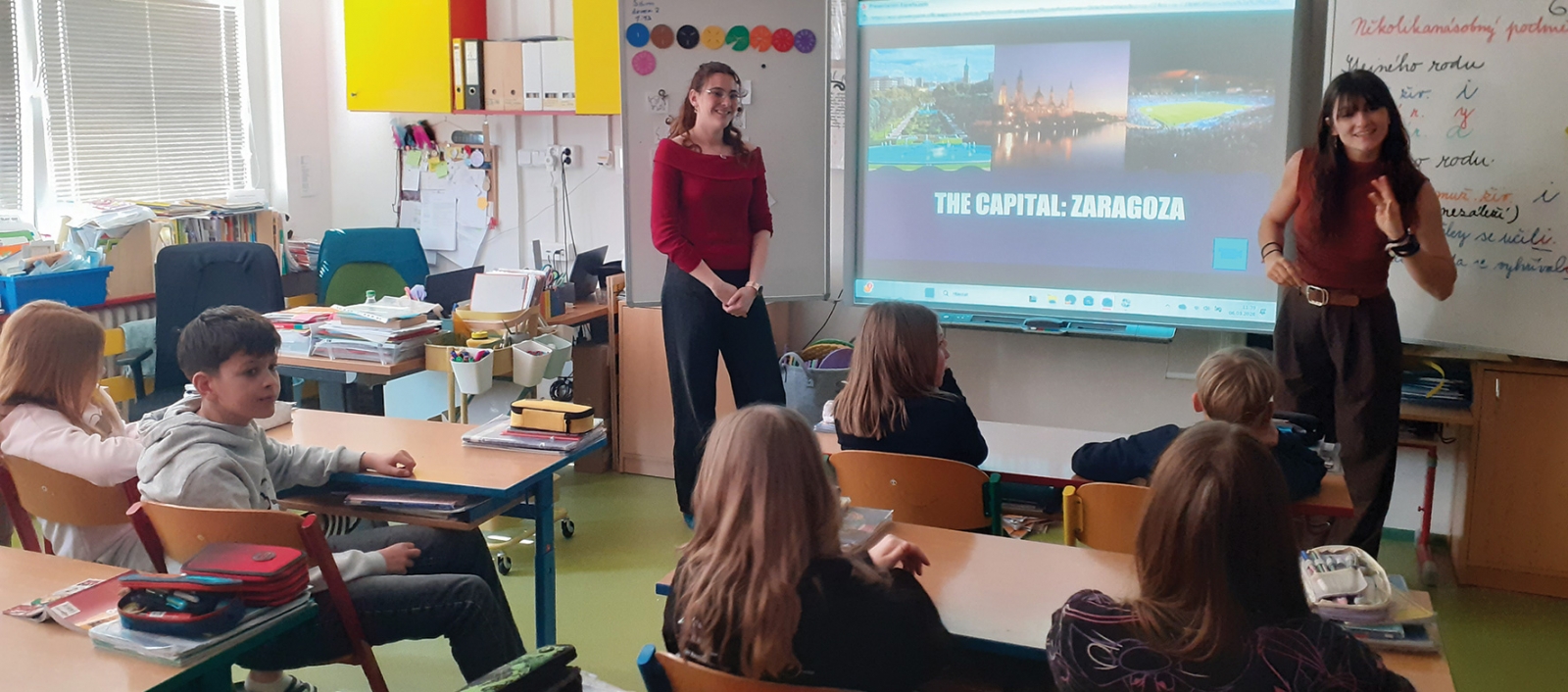 V ZŠ Mohylová jsme začátkem března měli vzácnou návštěvu - dvě učitelky ze španělské Zaragozy. Tři dny poznávaly naši školu a čtvrtý den převzaly otěže výuky. Žákům ukázaly fotografie a videa ze Zaragozy a děti zkoušely anglicky pojmenovat vše, co viděly. Po fotce flamenkové tanečnice následoval rychlokurz tohoto tance, doprovázený vtipnými instrukcemi: „Natáhni ruku k jabloni, utrhni jablko, zakousni se do jablka, zahoď jablko na zem a zavolej OLÉ!“ Čtvrťáci i páťáci rozveselení pohyby ohnivého tance postoupili ke hře BINGO, kde už se nemluvilo anglicky, ale španělsky. Ke každému obrázku BINGO mřížky se naučili jeho španělský název a nově naučená slovíčka si mezi sebou sdělovali i dávno poté, co se Španělky vrátily do své vlasti.