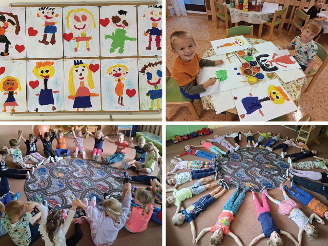 Září bývá v mateřských školách časem návratů a nových začátků. Děti si po prázdninách znovu hledají své místo ve třídě a obnovují nebo navazují přátelství. V naší školce jsme se proto v prvním měsíci zaměřili právě na téma vztahů. Ve třídě Myšek toto téma ožilo hned několika způsoby. Společně jsme tvořili řetěz přátelství, do něhož děti symbolicky vložily svůj dílek - ať už barevný, veselý, nebo hravý. Další výzvou bylo malování portrétů kamarádů. Každé dítě tak mohlo ukázat, jak svého kamaráda vidí, čeho si na něm všímá a jak si ho dokáže představit na papíře. Výsledkem jsou práce, které zaujmou na první pohled - nejen svou barevností, ale i příběhem, který nesou. Každý, kdo kolem nich projde, se zastaví a obdivuje je. Tyto obrázky nám připomínají, že přátelství není samozřejmost, ale dar, o který je potřeba pečovat.