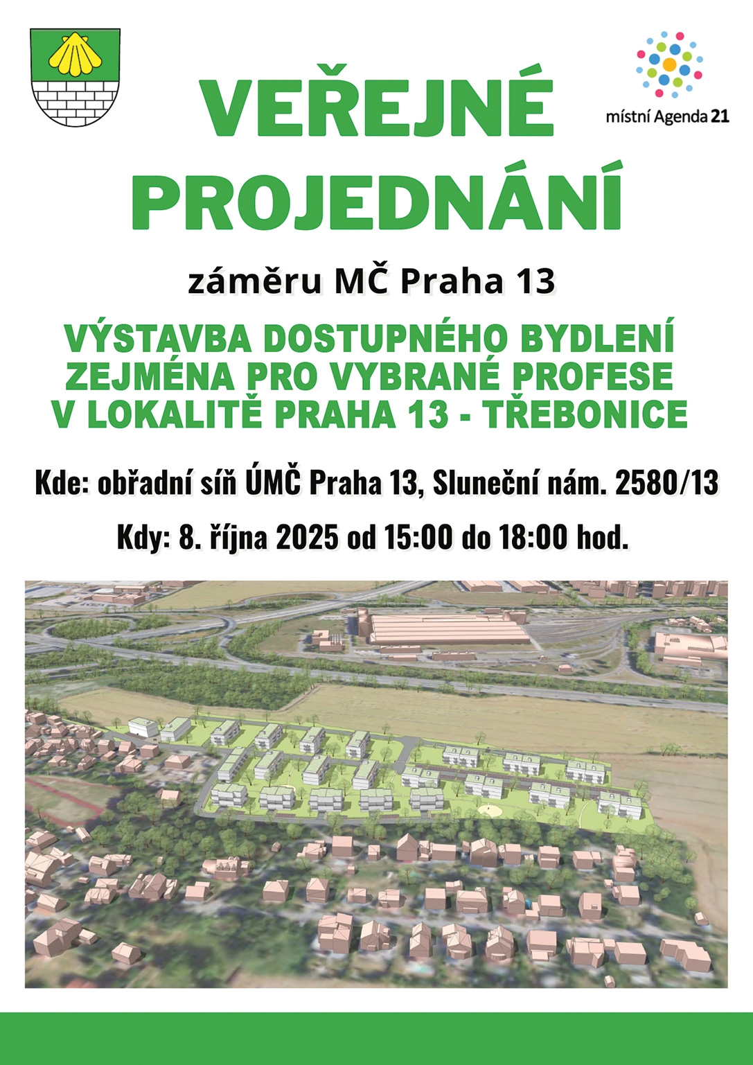 Srdečně vás zveme na Veřejné projednání týkající se záměru výstavby dostupného bydlení, zejména pro vybrané profese, v lokalitě Praha 13 -Třebonice, které se uskuteční ve středu 8. října 2025 od 15.00 do 18.00 hodin v obřadní síni radnice MČ Praha 13, Sluneční náměstí 2580/13.