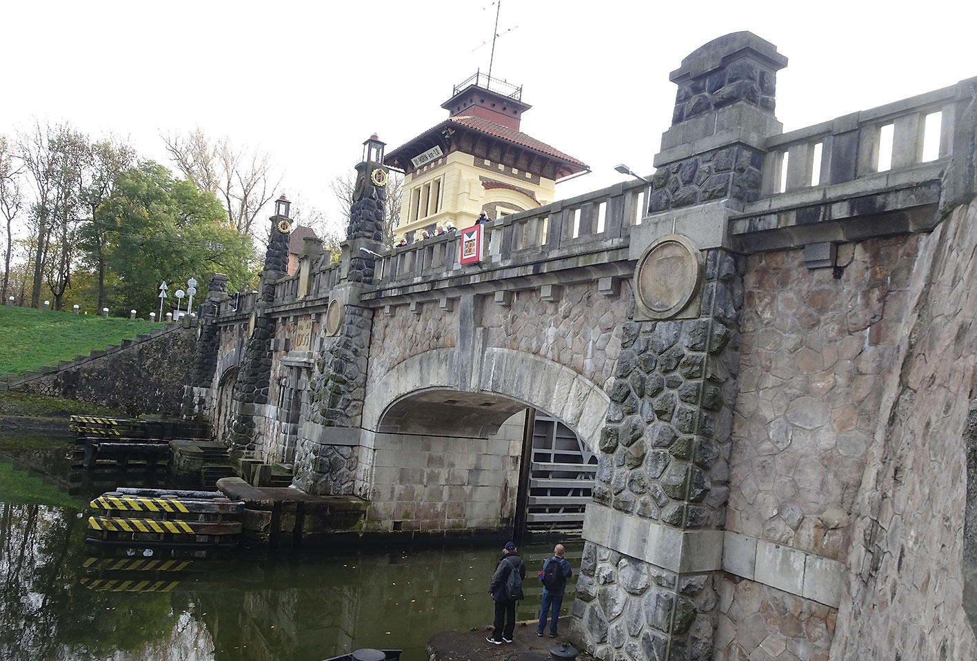 Spolu s opravou zámku probíhá i revitalizace zámeckého parku anglického stylu. Ale my jdeme dále. Dojdeme na náves s kapličkou a dál k historickému funkčnímu zdymadlu na plavebním kanále Mělník-Vraňany. Zdymadlo projektoval František Sander a bylo uvedeno do provozu v roce 1905. Překonává spád 8,5 m, čímž je nejvyšším plavebním stupněm v úseku Praha - Mělník. Zdymadlo se skládá ze dvou plavebních komor a je technickou památkou. V roce 1996 bylo doplněnou malou vodní elektrárnou o výkonu 30 kW. Napřed sejdeme dolů ke kanálu, kde vidíme krásně do komory, a nahoře od zdymadla je úžasný pohled na mělnický zámek. Po přejití zdymadla pokračujeme stále po modré podél kanálu, nikoli po asfaltové cyklostezce. Jdeme po rovince pohodlnou cestou s plavebním kanálem po pravé ruce. Na obzoru je vidět i cíl poutní cesty Říp. V klidu dojdeme k prvnímu plavebnímu mostu u Zelčína, který přejdeme. Z mostu lze vidět i na areál ZOO parku Zelčín se zvířaty a mnoha atrakcemi především pro děti. Je zaměřen na hospodářská zvířata, ale konají se zde i koncerty a jiné akce. Půjčují i rafty a je tu možnost ubytování. Jdeme stále po rovince, ale po druhém břehu podél kanálu vlevo a sadů vpravo. Dojdeme k dalšímu plavebnímu mostu, který opět přejdeme na druhý břeh a jdeme stále rovně podél kanálu do obce Lužec nad Vltavou.